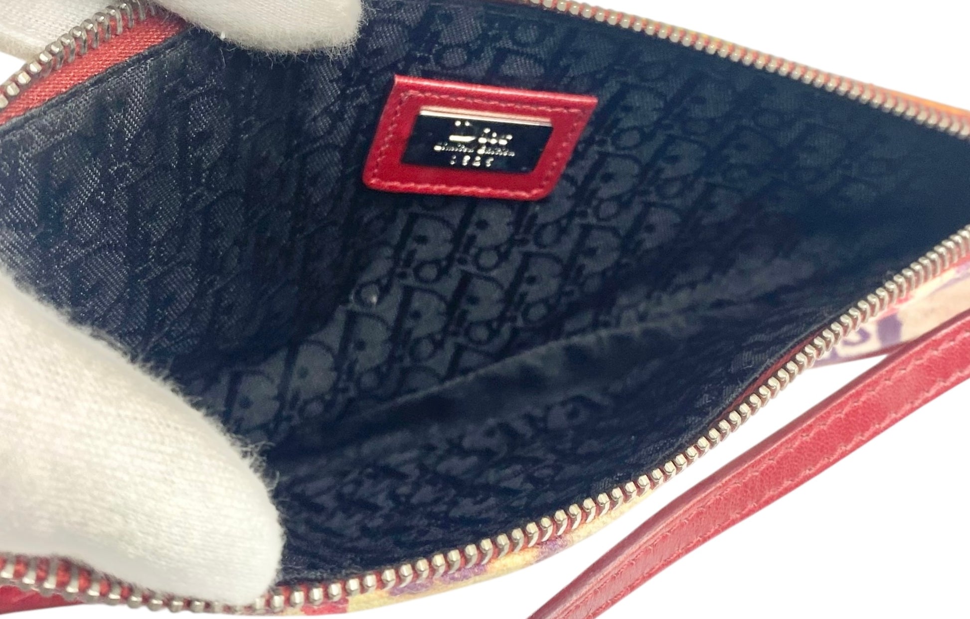 This unique bag features a vibrant print with a skull button and a clasp adorned with Swarovski crystals with Red Leather strap and trim. The clasp can be detached to turn into a wristlet if desired.