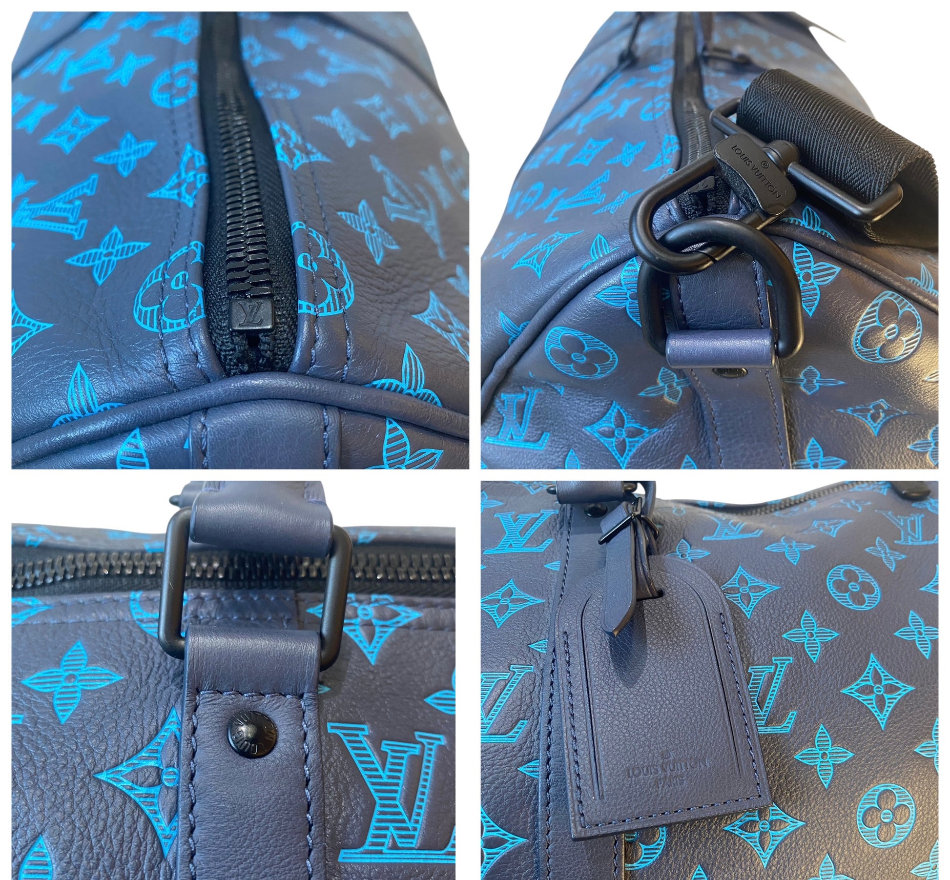Louis Vuitton Navy and Teal River Monogram 50 Keepall Bandoulière. Elegant Louis Vuitton tote with iconic monogram shadow in Teal River and Navy. The Keepall in the 50 size (literally referring to its 50cm length), comprises an ultra-spacious interior that is capable of fitting a great amount of clothing and travel essentials. The Keepall is not only highly practical but will have you traveling in style!