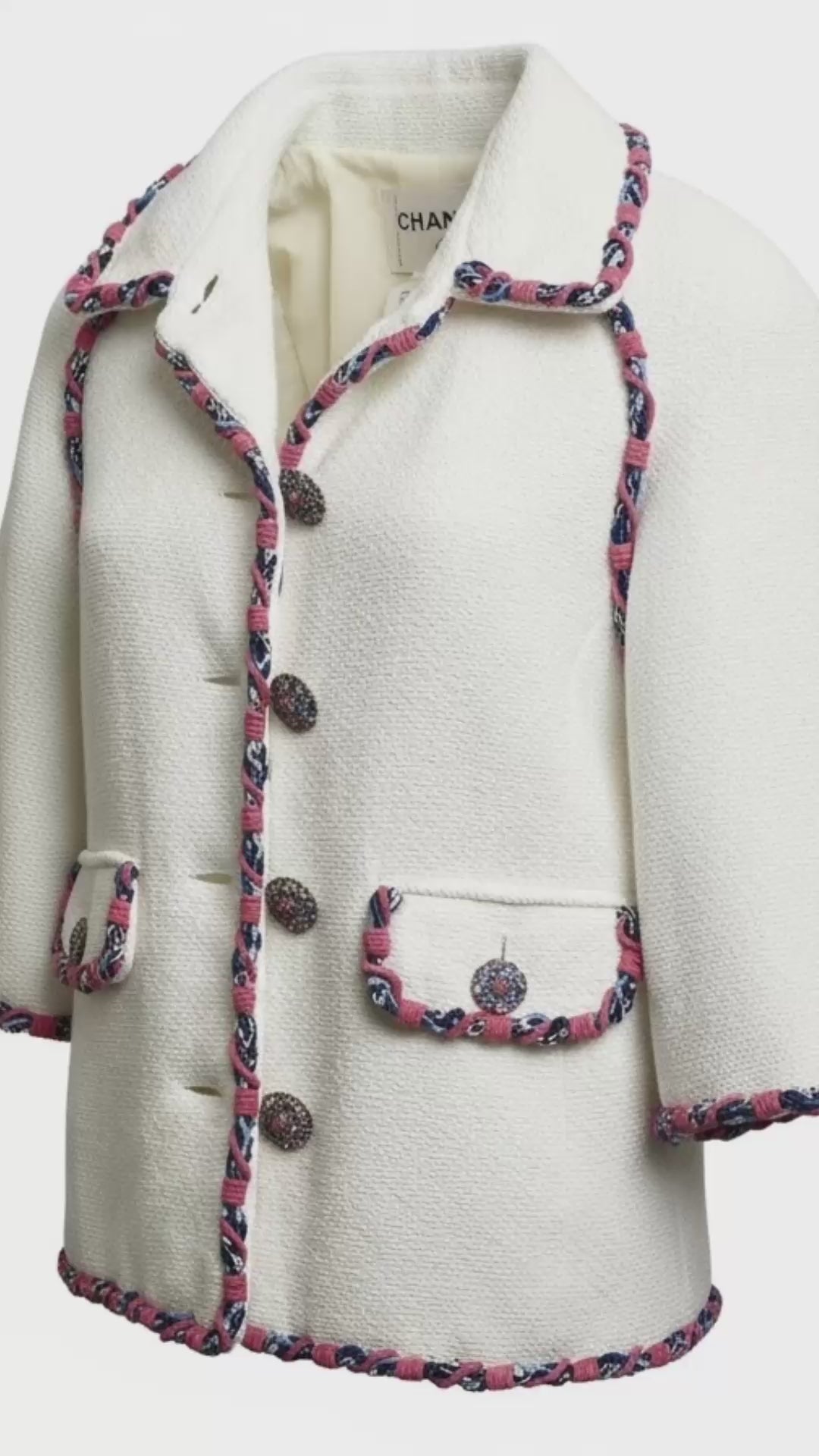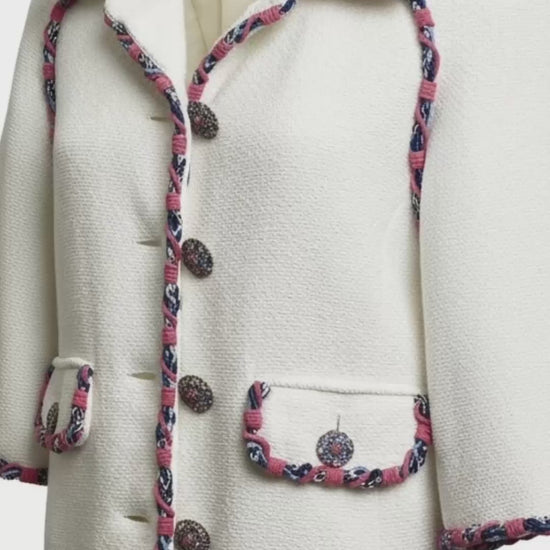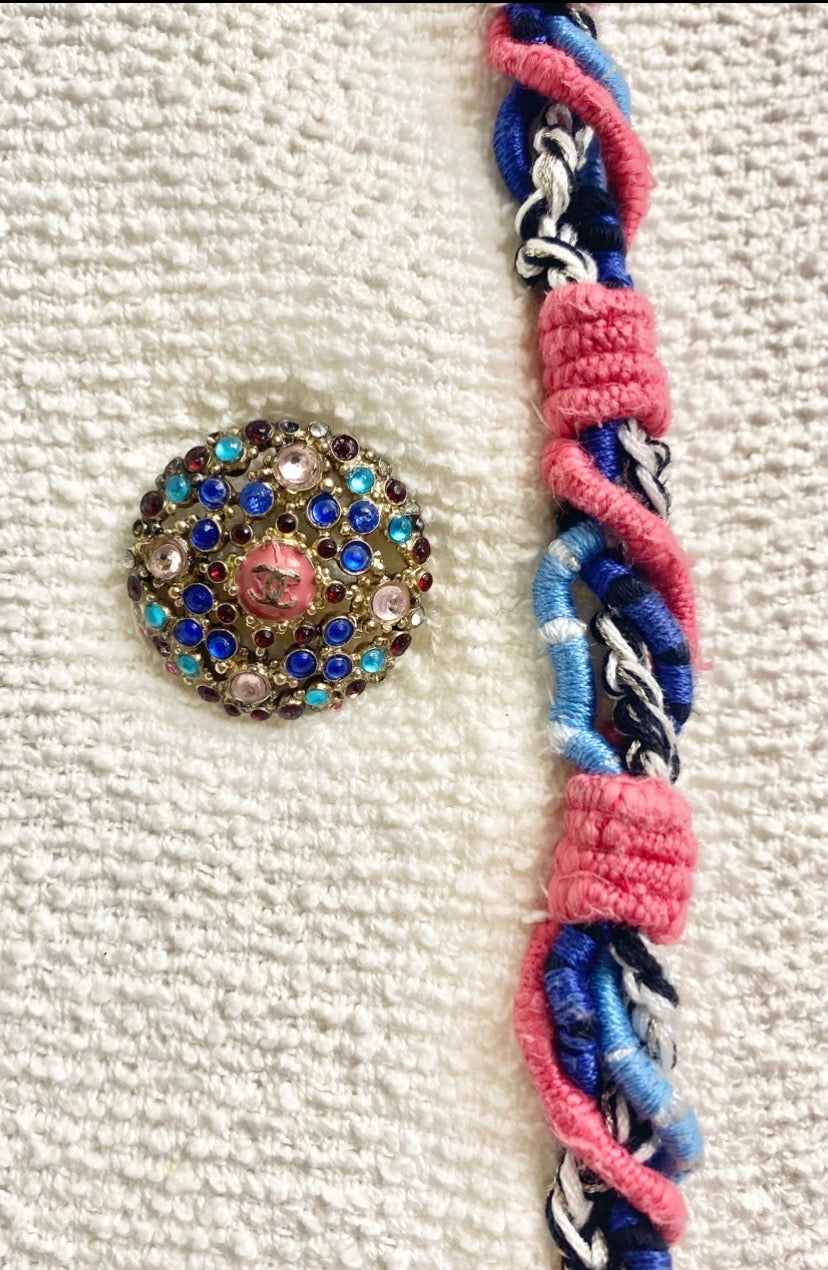 Elegant Chanel Cotton Tweed Short Jacket with gorgeous Huge Swarovski Crystal Embellished Pink, Blue, and Red Buttons, 3/4 sleeves, with Bright Braided Pink and Blue Trim. Two front pockets.