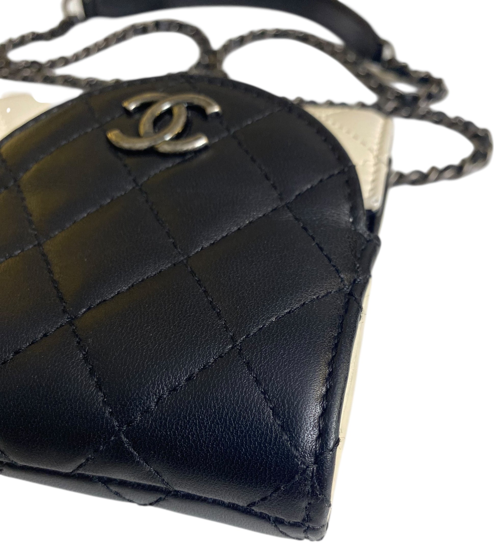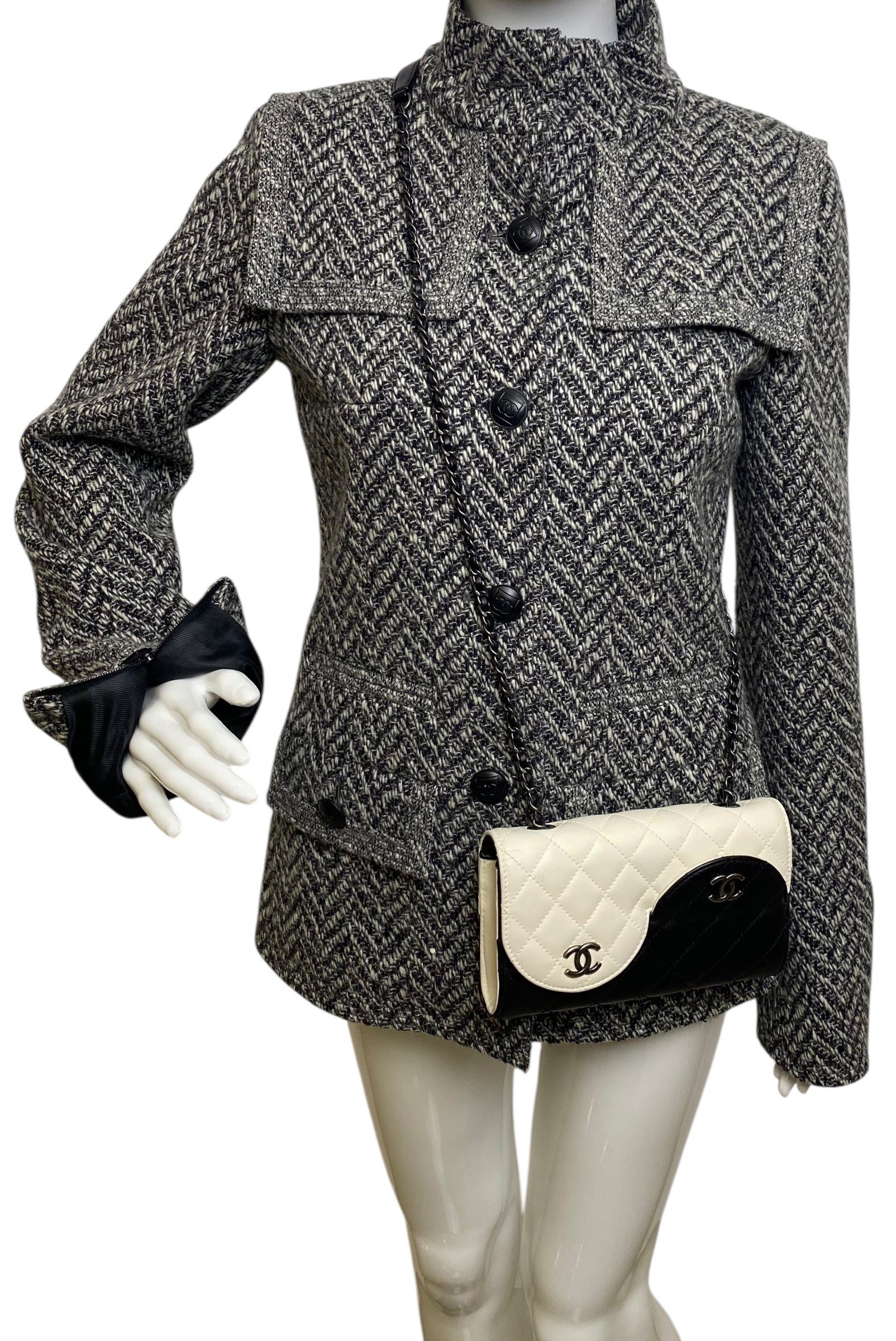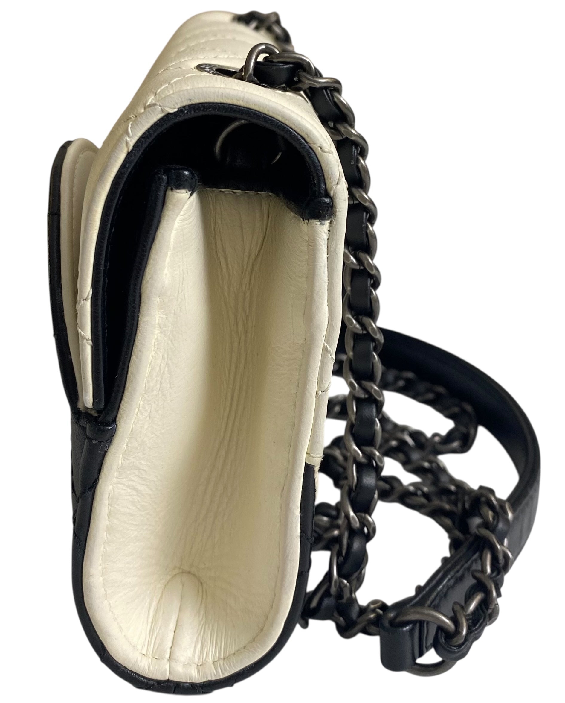 The Chanel Yin Yang WOC is a rare and highly sought-after collector’s piece. Black and ivory colorblock quilted leather Chanel Yin Yang Mini Classic Single Flap Bag with ruthenium antique silver hardware, single chain-link and leather shoulder strap, dual CC adornments at front, black leather lining, single slip pocket at interior wall and dual snap closures at front flap. Made in Italy. Hard to find.