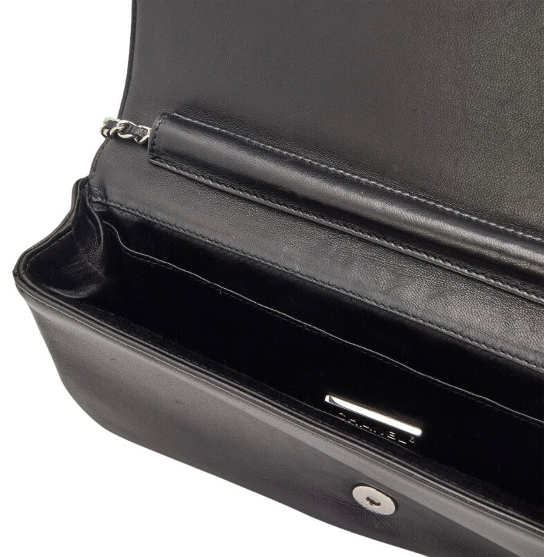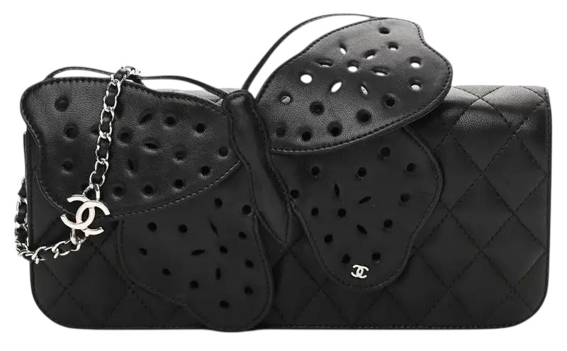 Super soft Lambskin Black quilted Leather with an attached Leather 🦋 Butterfly and small metal CC! Silver Chain Strap with metal CC logo. Can double as both a hand held clutch and crossbody bag. Metal Limited Edition Plaque Made in Italy, with Black Satin Lining.