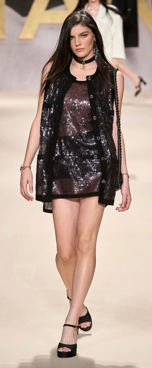 Rare Chanel 22S CC Sequin Cream Iridescent Vest Mini Dress Waistcoat Cardigan FR 40