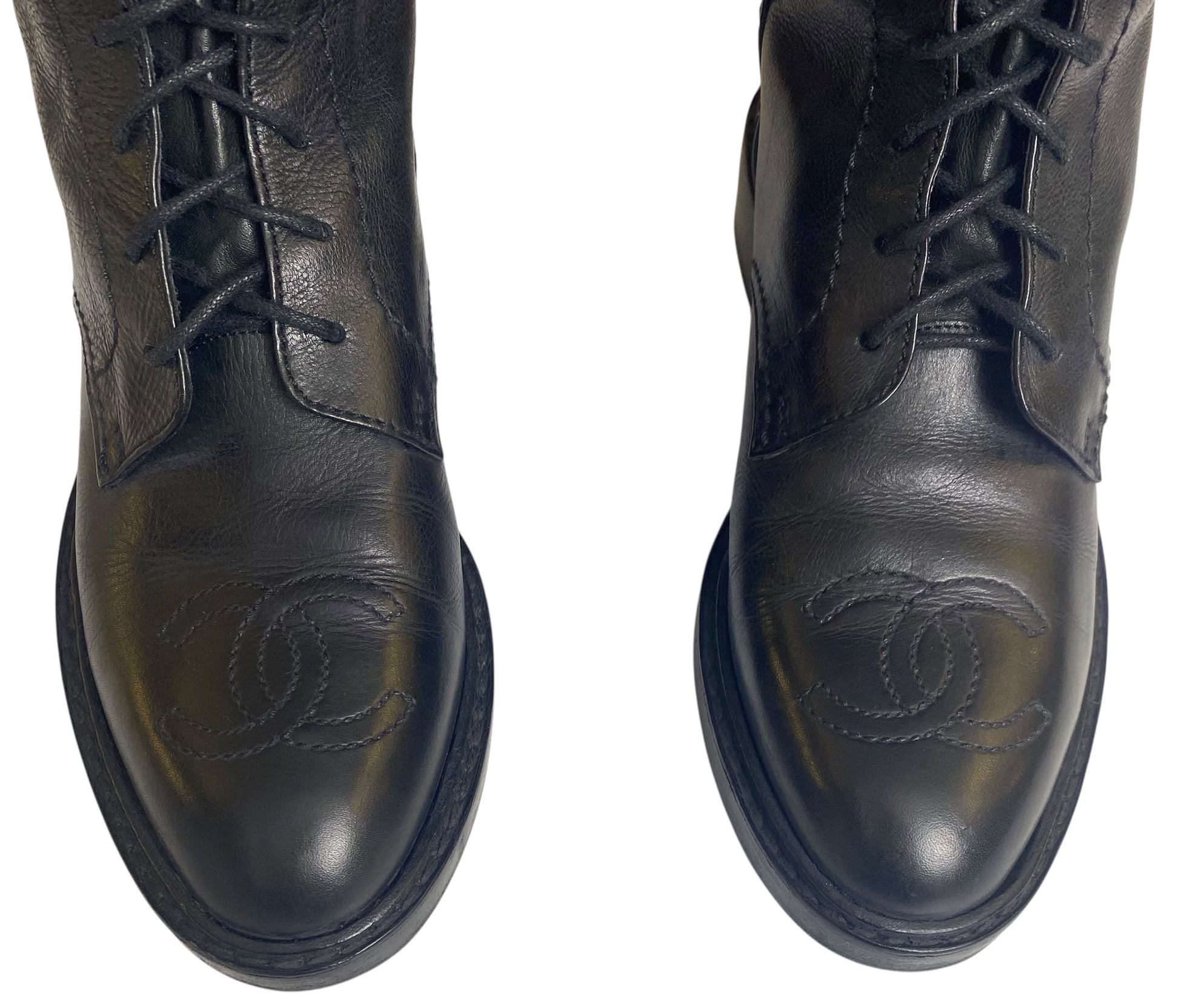These boots are amazing with huge stitched CCs on the front, durable strong Lambskin leather traditional riding boot style, with the addition of tops that can be worn up, thigh length, or turned over in a cuff. The boots are lined in cream lambskin leather. There are laces at the ankle front to aid getting the boots on.