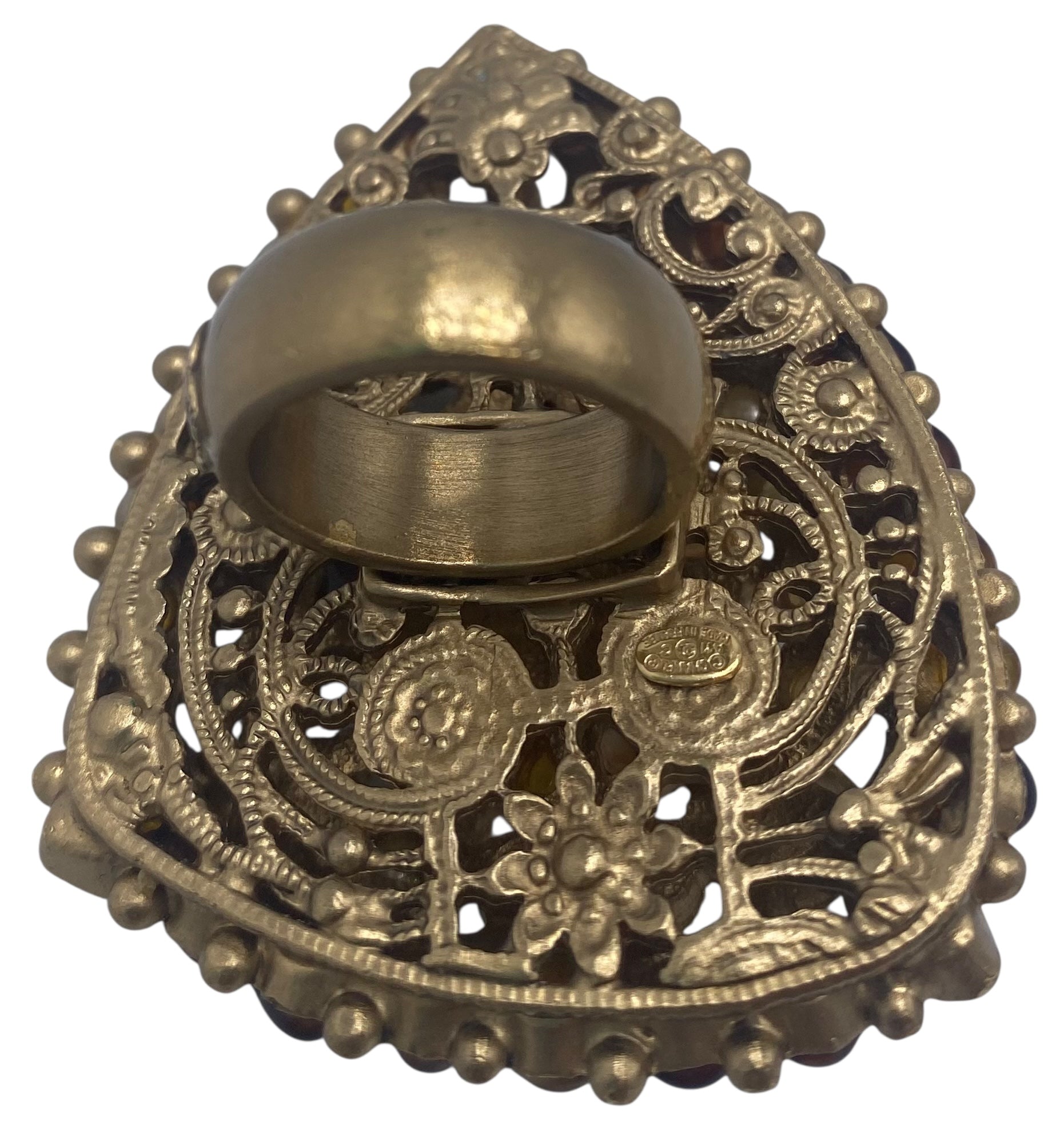 This XL Chanel ring is Rare and Exquisite in Gold Tone Metal, Covered with brown tones gripoix stones, pearls and a CC logo. Gold CC at side of the ring. Intricate metal detailing on underside of this ring.