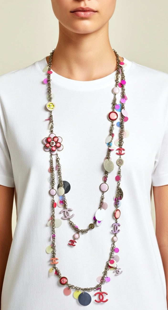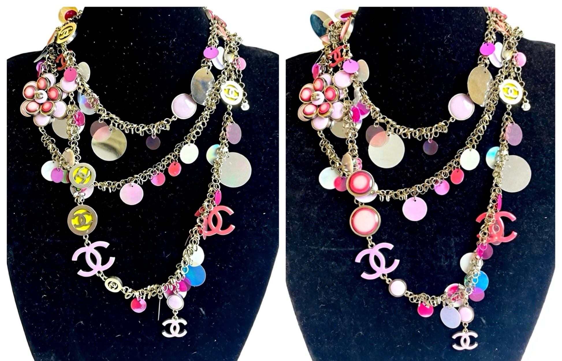 Dazzling Retro “Flower Power” Candy Colors Pink, Silver, Purple, Neon necklace or belt with hundreds of tiny rings with dangling holographic pink, light reflective iridescent, and mirror pallet yes, 7 CC double sided charms, one Large pink and lavender camellia CC flower, Twelve "button" charms in resin hide a CC cut-out on the opposite side with a contrasting color back, and a lobster clasp closure with a dangling CC signature plate. This allows you to fasten the necklace or belt at different points and create varying lengths according to your taste.